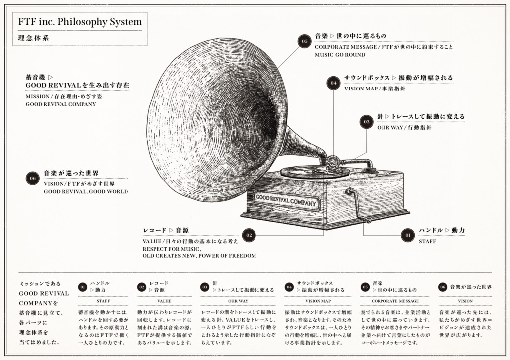FTFさまは当初、理念のようなものを決めると、斜に構えたり拒否したりするスタッフが出てくることを懸念していたそう。ですが、理念をつくった背景・経緯から全社会議で伝えたり、マネジメント層へ浸透ワークショップを開催しながら伝えることで共感が得られ、特にコーポレートメッセージ「MUSIC GO ROUND」は社員さまに広く浸透しました。採用活動でも、 理念への共感による応募が増えて、”音楽・レコードに携わる仕事がしたい” だけでなく “FTFで働きたい” という動機への変化が見られました。