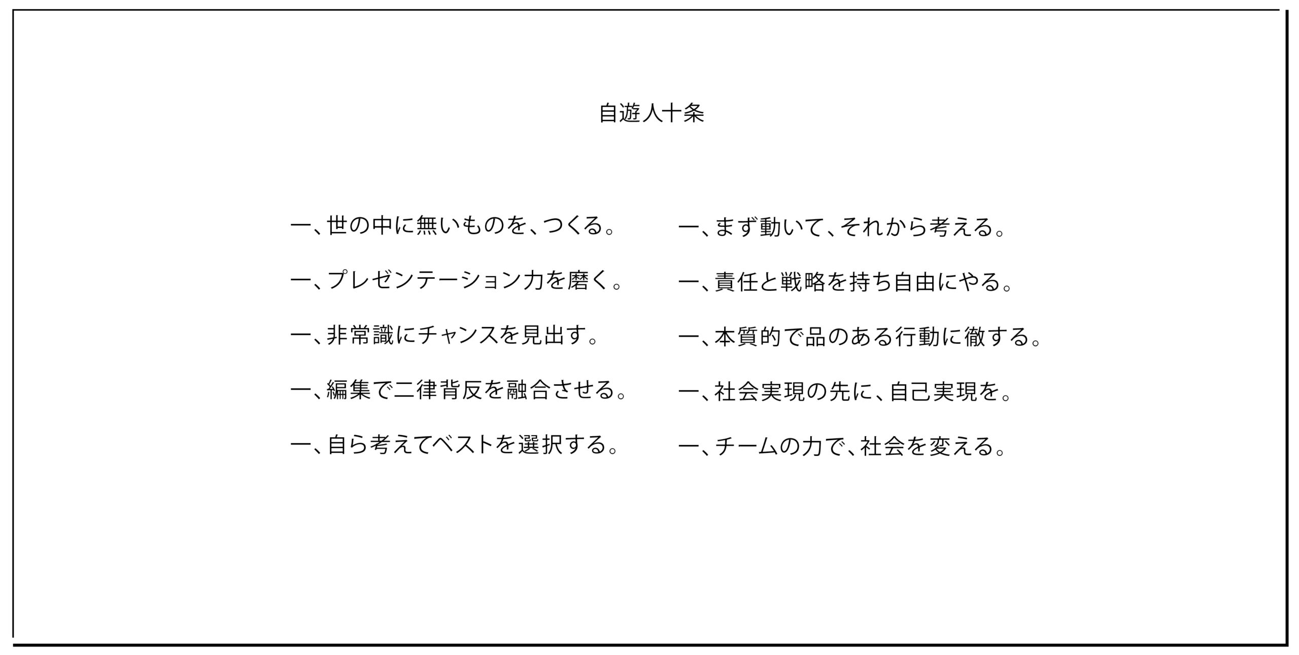 自遊人の採用施策は三本柱で展開。まず、創業以来一貫する「想像力で社会貢献を目指す」という信念を基に、価値観を体系化した「自遊人十条」を作成。岩佐氏への対話を重ね、採用基準となるモノサシを共有可能な形で言語化した。