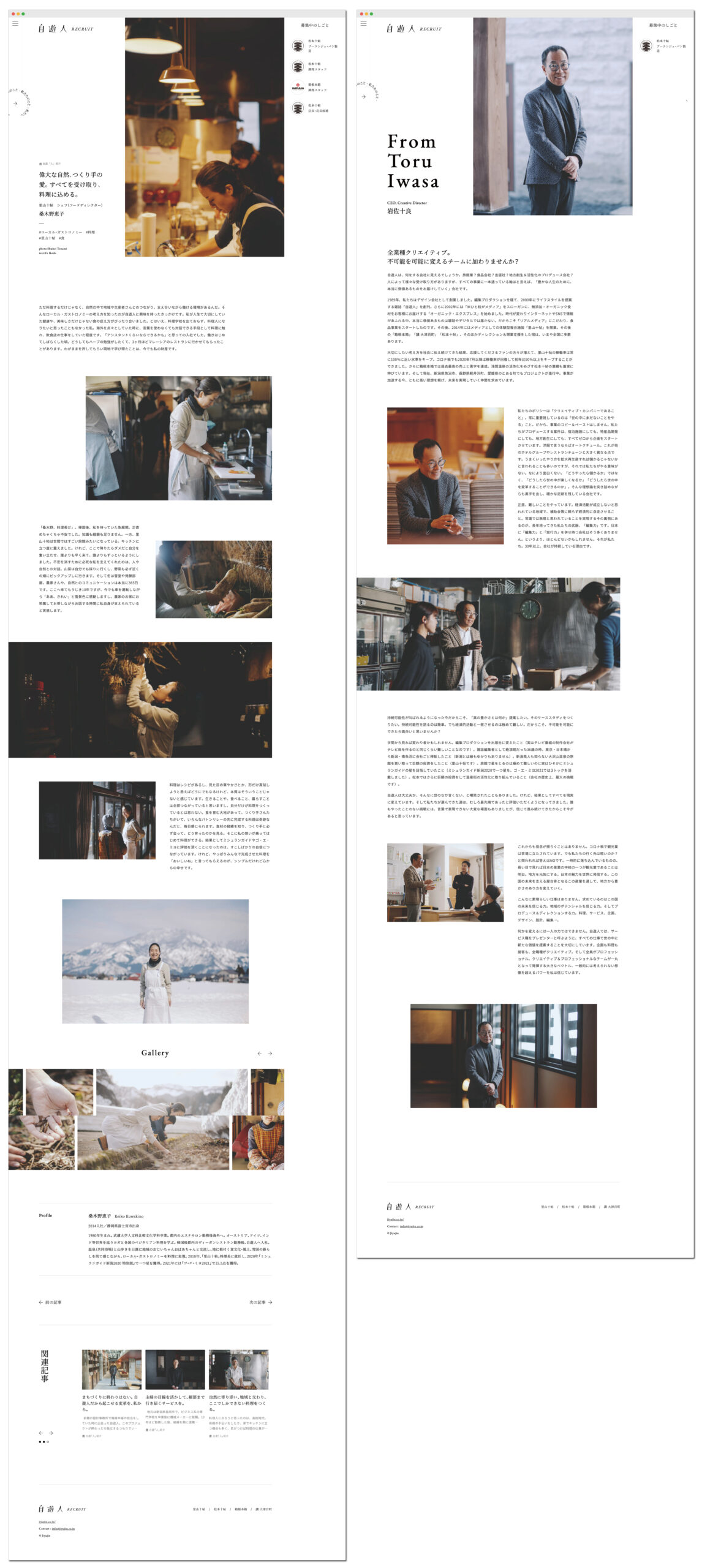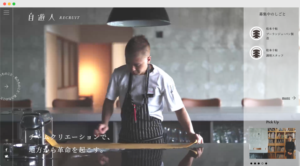 採用スローガンの作成/自遊人十条(価値観の言語化)の作成/採用サイトの作成・記事制作。採用HPの制作依頼であったが、単にサイトを作るだけではなく、コンセプトとなる採用スローガン(岩佐十良さんの考え方の採用向け言語化)、社内のらしさ(VALUE)言語化をセットで行うことで、会社の軸を整理しながらクリエイティブを形にした。
